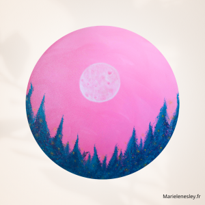 Tout est une question de cycle. Le temps, le soleil, la lune, l’évolution de la vie, etc… Ce tableau représente à mon sens un instant T. Je peux y voir le début d’une nouvelle journée d’hiver qui commence autant qu’une fin de journée d’été. Mon imagination me laisse entendre et imaginer le vole des deux oiseaux au-delà des sapins, les lucioles ou lumières bougeant au rythme de l’air. Ce tableau porte vers un état méditatif.