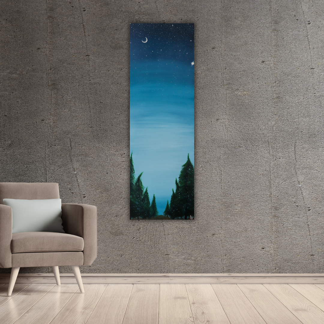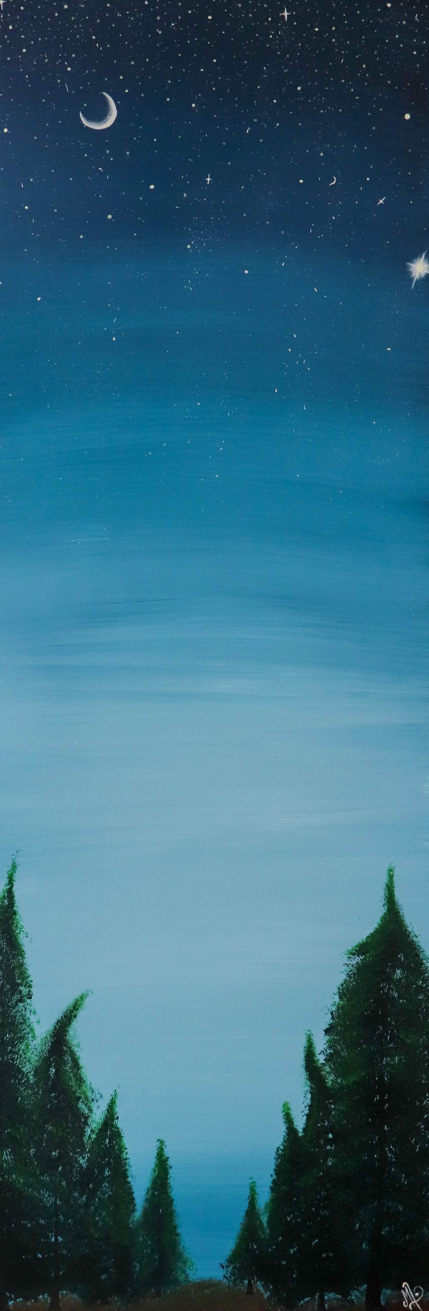 C’est tout naturellement que cette peinture est venu, pinceaux après pinceaux. Pour continuer de la faire vivre au-delà de mes souvenirs. La lune et les étoiles en phosphorescence, pour rappeler l’espoir de la renaissance après une telle destruction.
