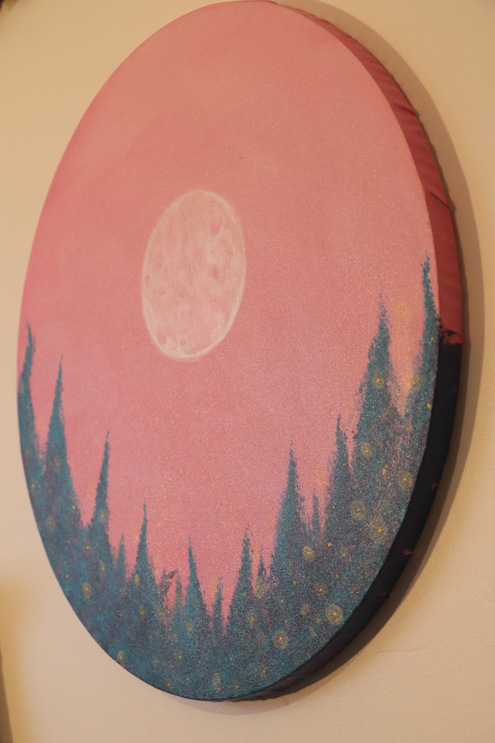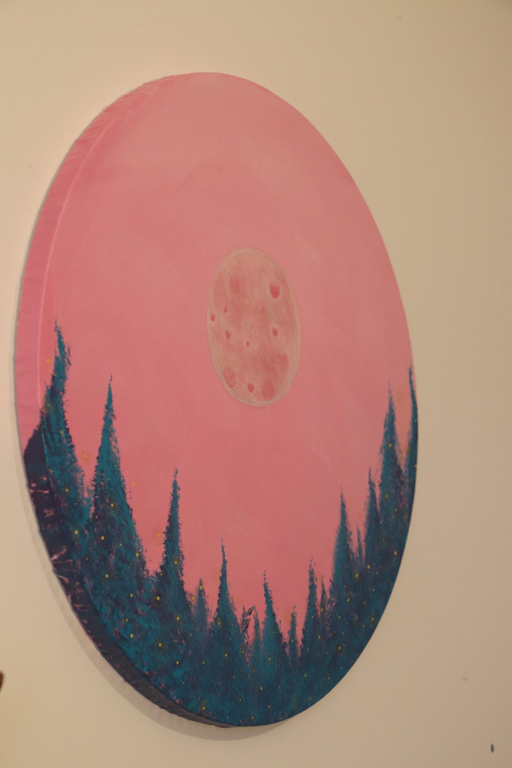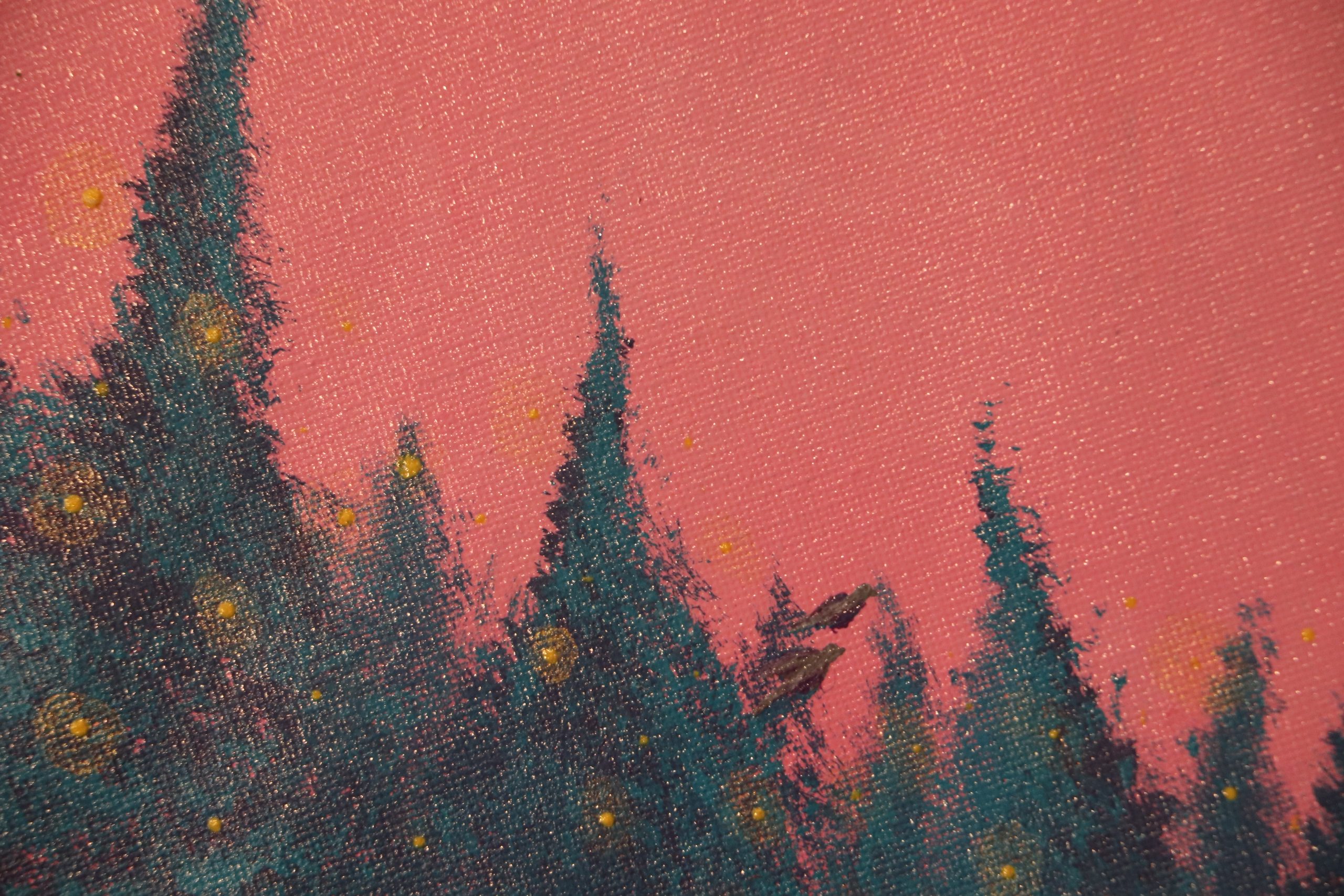 Tout est une question de cycle. Le temps, le soleil, la lune, l’évolution de la vie, etc… Ce tableau représente à mon sens un instant T. Je peux y voir le début d’une nouvelle journée d’hiver qui commence autant qu’une fin de journée d’été. Mon imagination me laisse entendre et imaginer le vole des deux oiseaux au-delà des sapins, les lucioles ou lumières bougeant au rythme de l’air. Ce tableau porte vers un état méditatif.