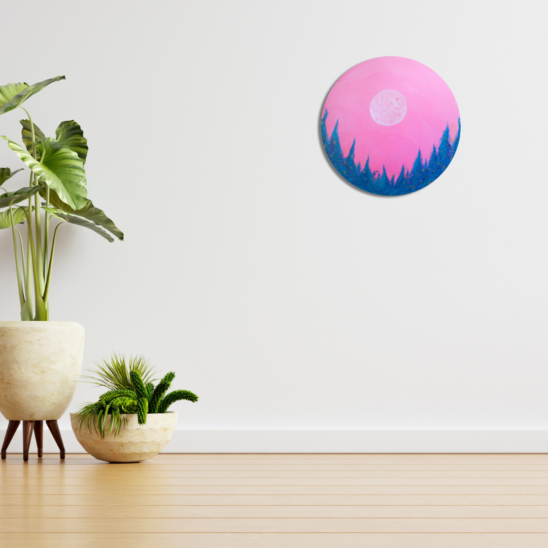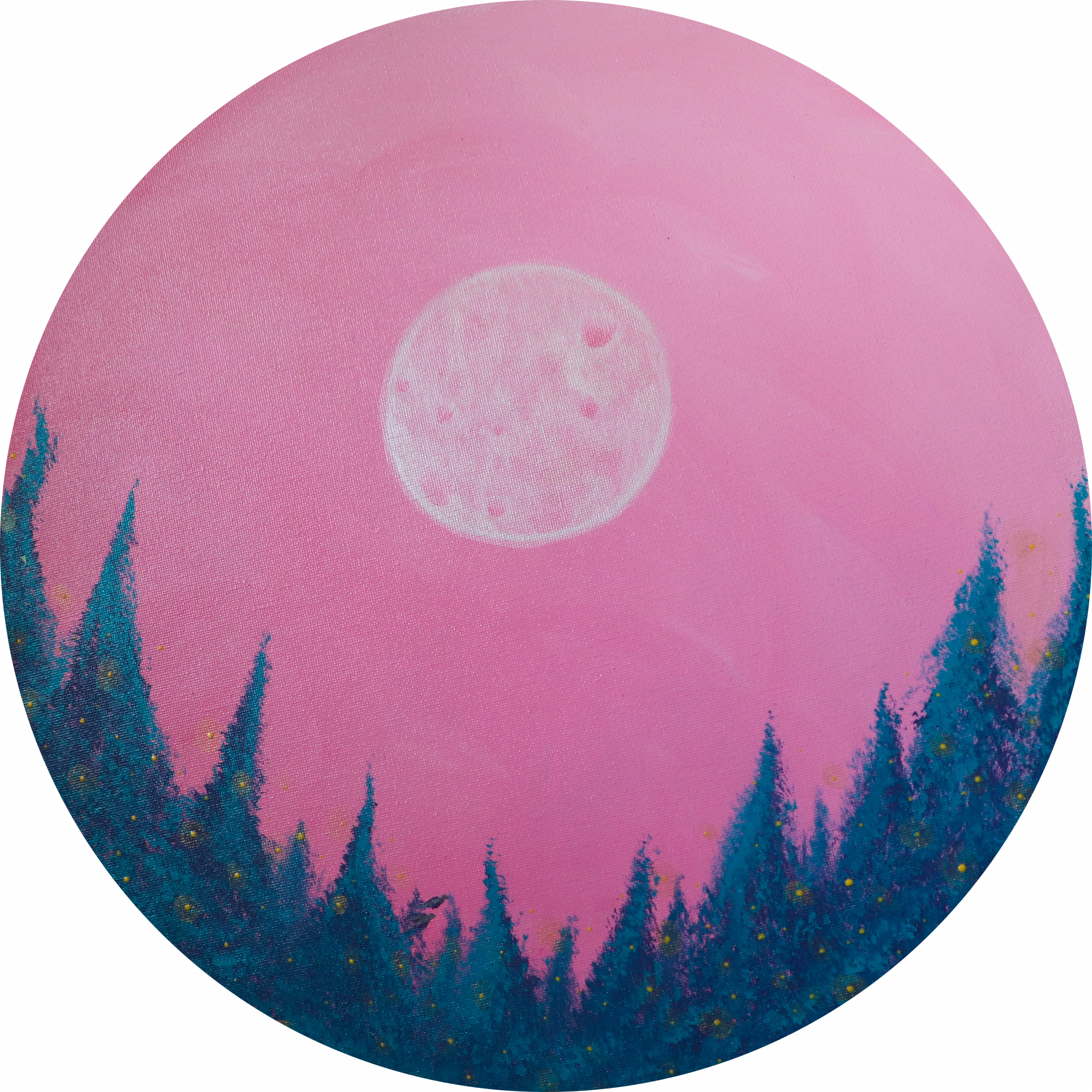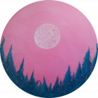 Tout est une question de cycle. Le temps, le soleil, la lune, l’évolution de la vie, etc… Ce tableau représente à mon sens un instant T. Je peux y voir le début d’une nouvelle journée d’hiver qui commence autant qu’une fin de journée d’été. Mon imagination me laisse entendre et imaginer le vole des deux oiseaux au-delà des sapins, les lucioles ou lumières bougeant au rythme de l’air. Ce tableau porte vers un état méditatif.