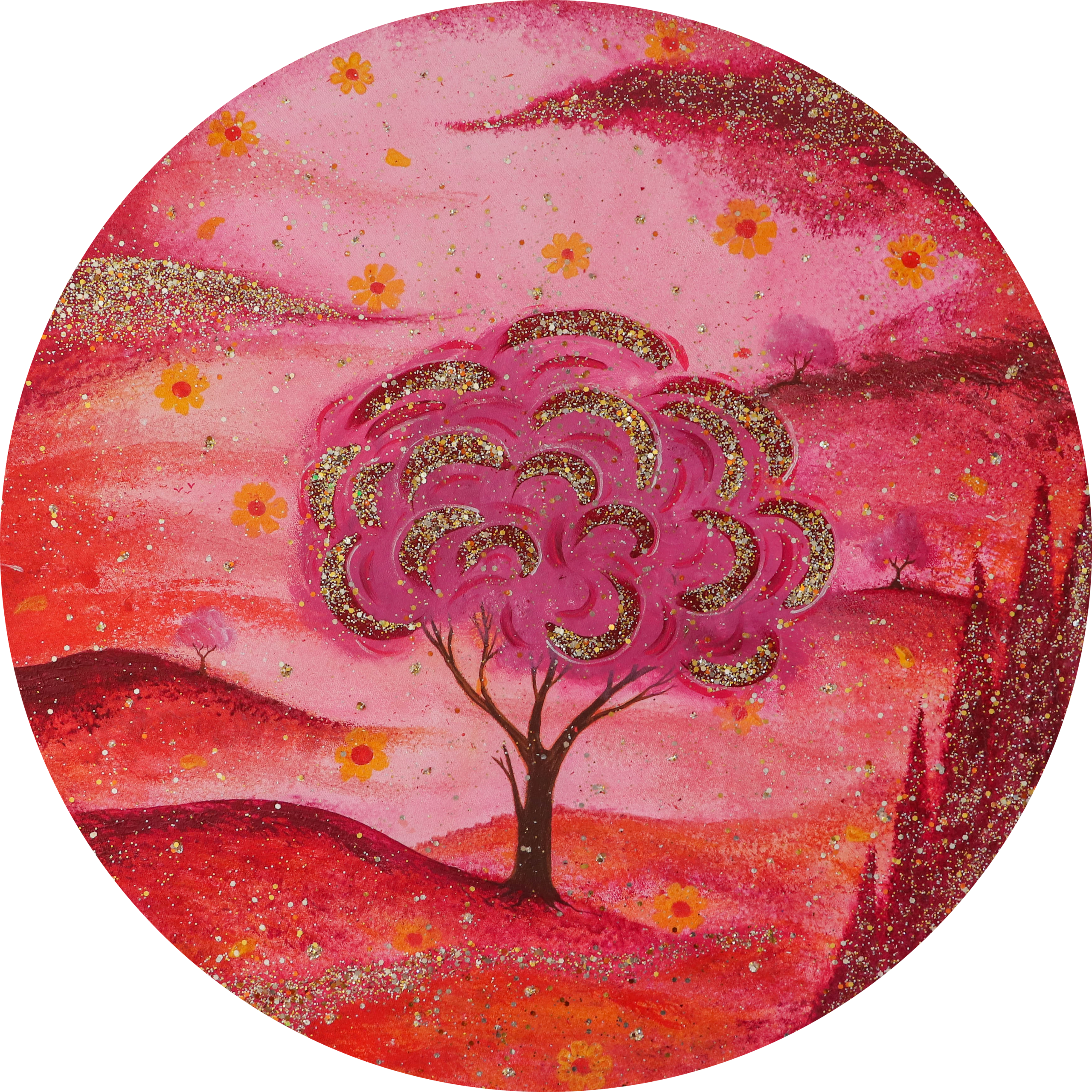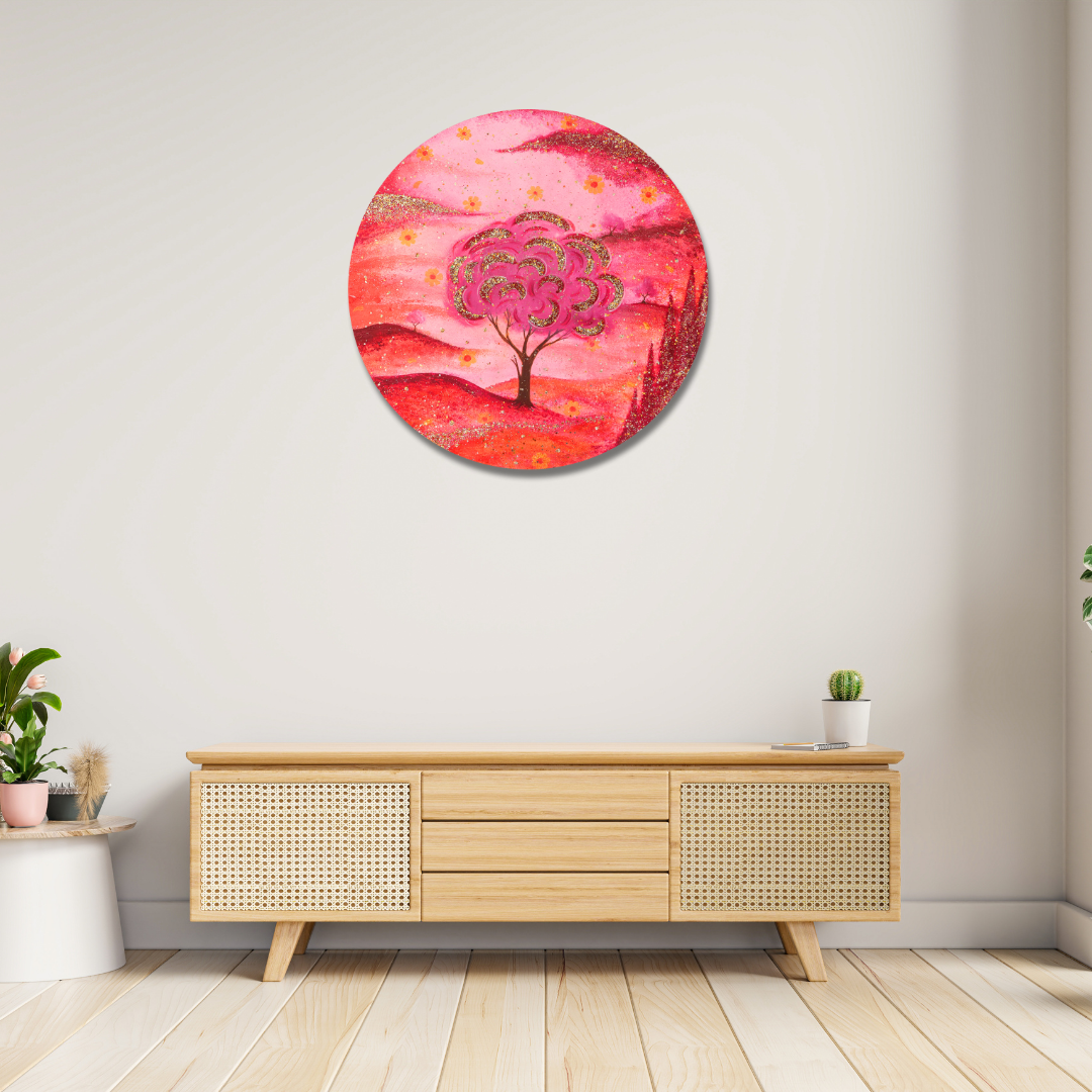 Ce tableau s’intitule pour moi une nouvelle ère, nous le voyons différemment selon l’angle et la lumière de la pièce. Il est difficile de le capturer en image tellement il bouge. Quand je rentre, je ne vois que le reflet des paillettes, mais au fur et à mesure que j’avance et tourne vers la gauche, c’est comme si le « voile » de paillettes s’estomper pour rendre le paysage visible puis ensuite, tous les petits détails apparaissent.